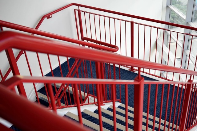 Incorporating bold design choices, such as the striking red finish, allows us to elevate a standard safety feature into a design highlight. Installation is planned to minimize disruption, ensuring the office remains operational throughout the process. With expertise in retrofitting projects, we deliver solutions that meet safety standards and add a unique, modern aesthetic to the space.
